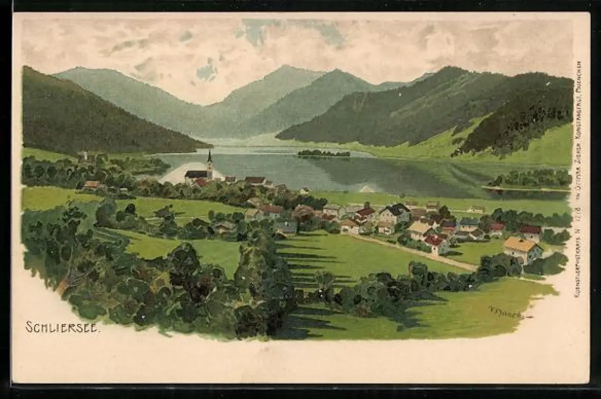 Lithographie Schliersee, Ortsansicht mit Kirche