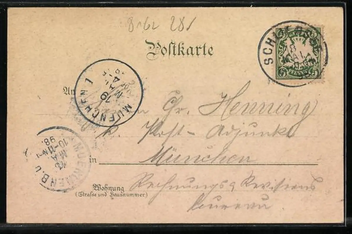 Personenbezogene Daten auf der Rückseite der Karte wurden durch blauen Textmarker unkenntlich gemacht. Die blauen Stellen sind auf die Vorderseite durchgeweicht und wirken sich negativ auf das Postkartenfoto aus