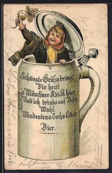 Lithographie Schönste Grüsse bringt Dir heut `s Münchner Kindl...
