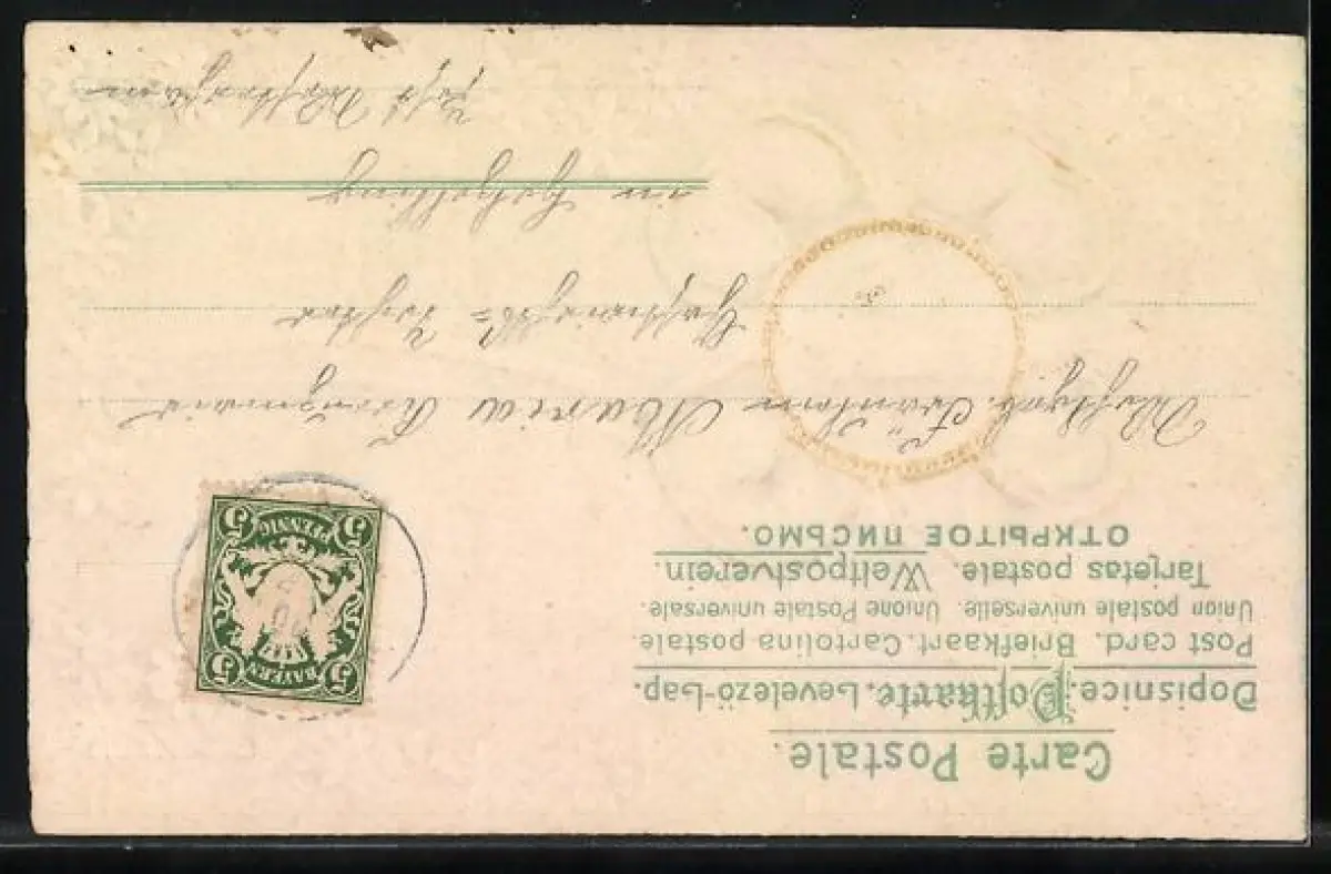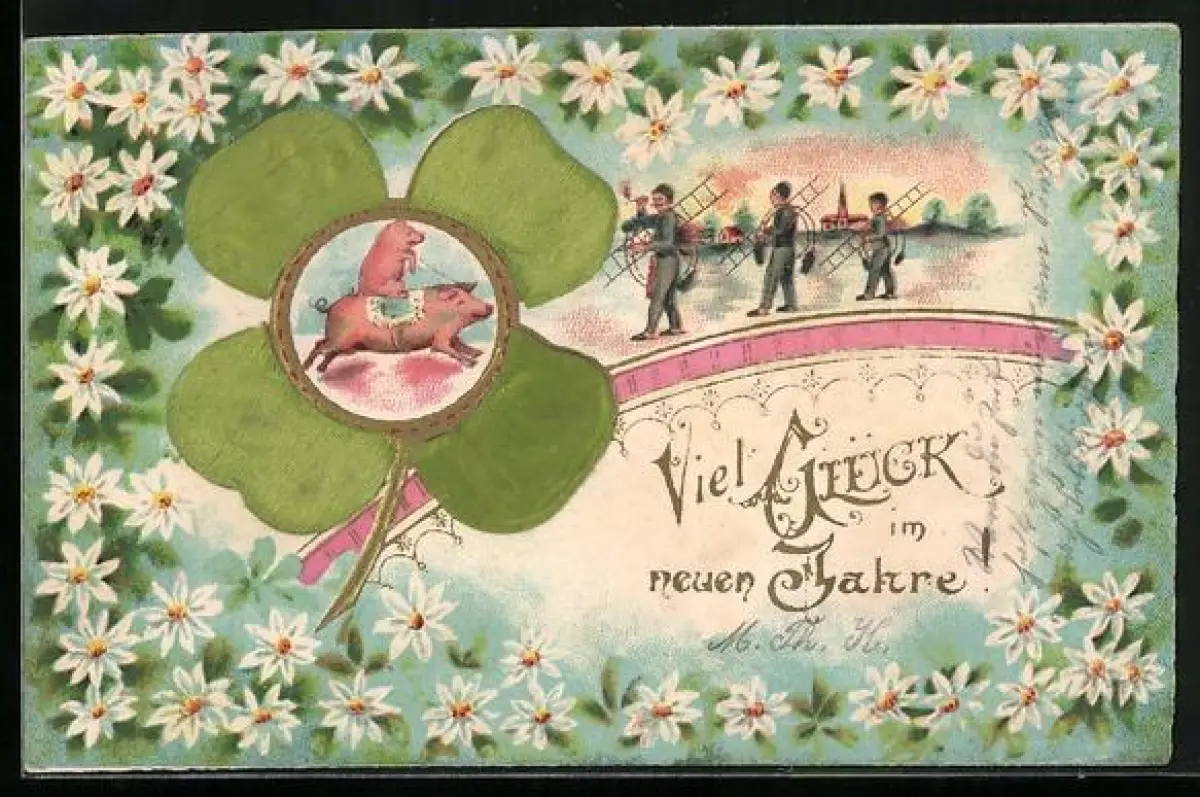 Lithographie Schornsteinfeger, Kleeblatt, Schwein reitet auf Schwein, Blumen