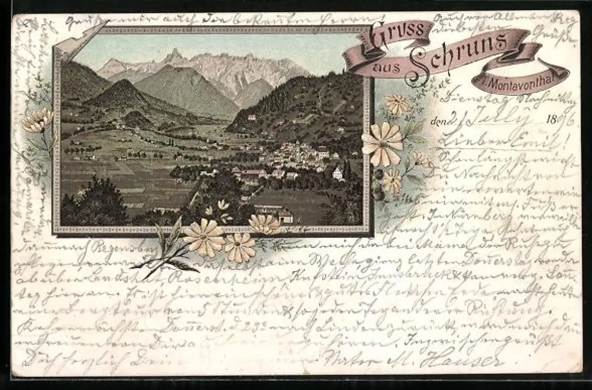 Lithographie Schruns, Ortsansicht aus der Vogelschau