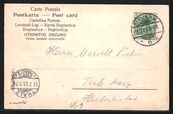 gelaufen 1903, Eckknick re. unten, guter Zustand