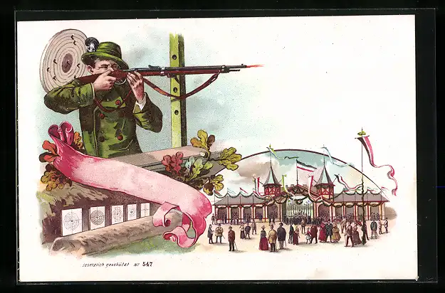 Lithographie Schützenfest, Schütze beim anvisieren seines Ziels, Zuschauer vor der Festhalle