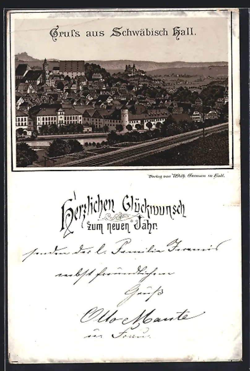 Lithographie Schwäbisch Hall, Stadtansicht mit Schloss und Altstadt