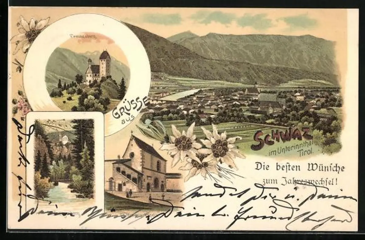Lithographie Schwaz i. Unterinnthal, St. Michaels-Kapelle, Freundsberg, Ortsansicht