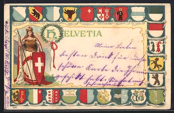 Lithographie Schweiz, Helvetia mit Speer und Schild, Wappen von Vaud, Tessin und Aargau