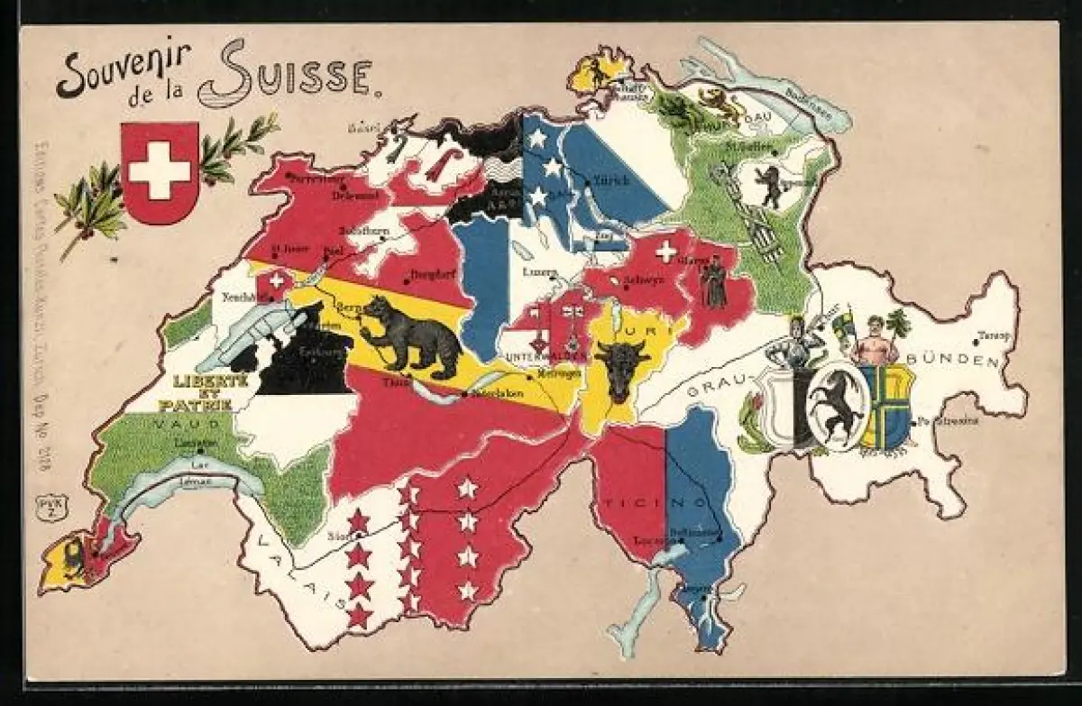 Lithographie Schweiz, Landkarte mit den Kantonen der Schweiz, Wappen