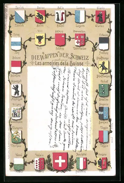 Lithographie Schweizer Kantonswappen, Nationalwappen im Ehrenkranz
