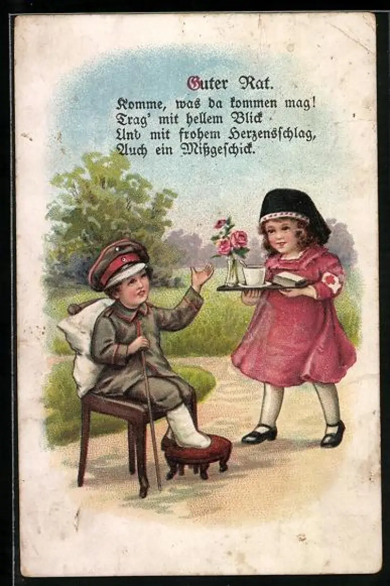 Lithographie Schwester vom Roten Kreuz umsorgt verwundeten Soldaten