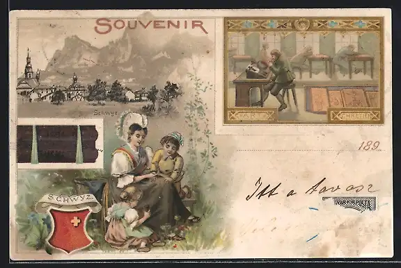 Lithographie Schwyz, Kakao Suchard, Ortsansicht, Mutter in Tracht mit ihren Kindern, Wappen