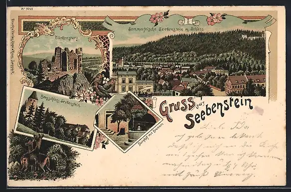 Lithographie Seebenstein, Ruine Türkensturz, Bergschloss, Burghof mit Brunnen, Totalansicht