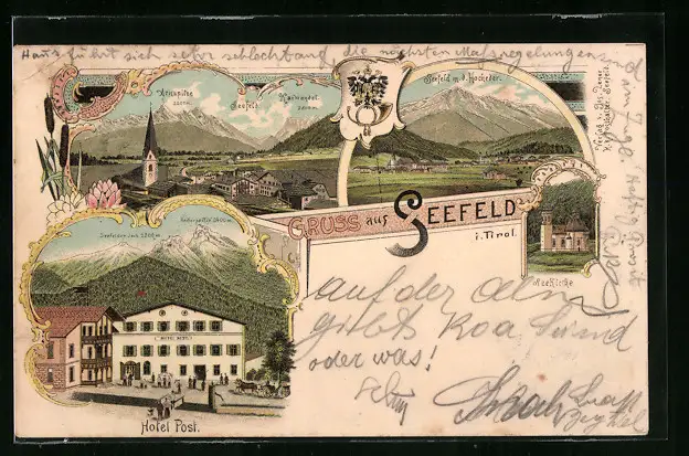 Lithographie Seefeld, Hotel Post, Ortsansicht m. d. Hocheder, Seekirche