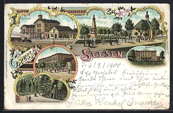 Lithographie Seesen, Partie mit Bahnhof, Denkmal m. Kirche, Jacobson-Schule & Kur-Hotel