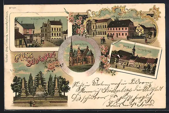 Lithographie Seidenberg, Markt, Evang. Kirche, Evang. Schule, Kriegerdenkmal