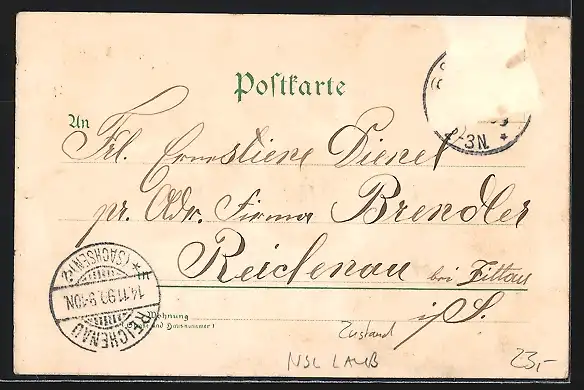 gelaufen 1899, Briefmarke entfernt, rückseitig Oberflächenschaden, guter Zustand