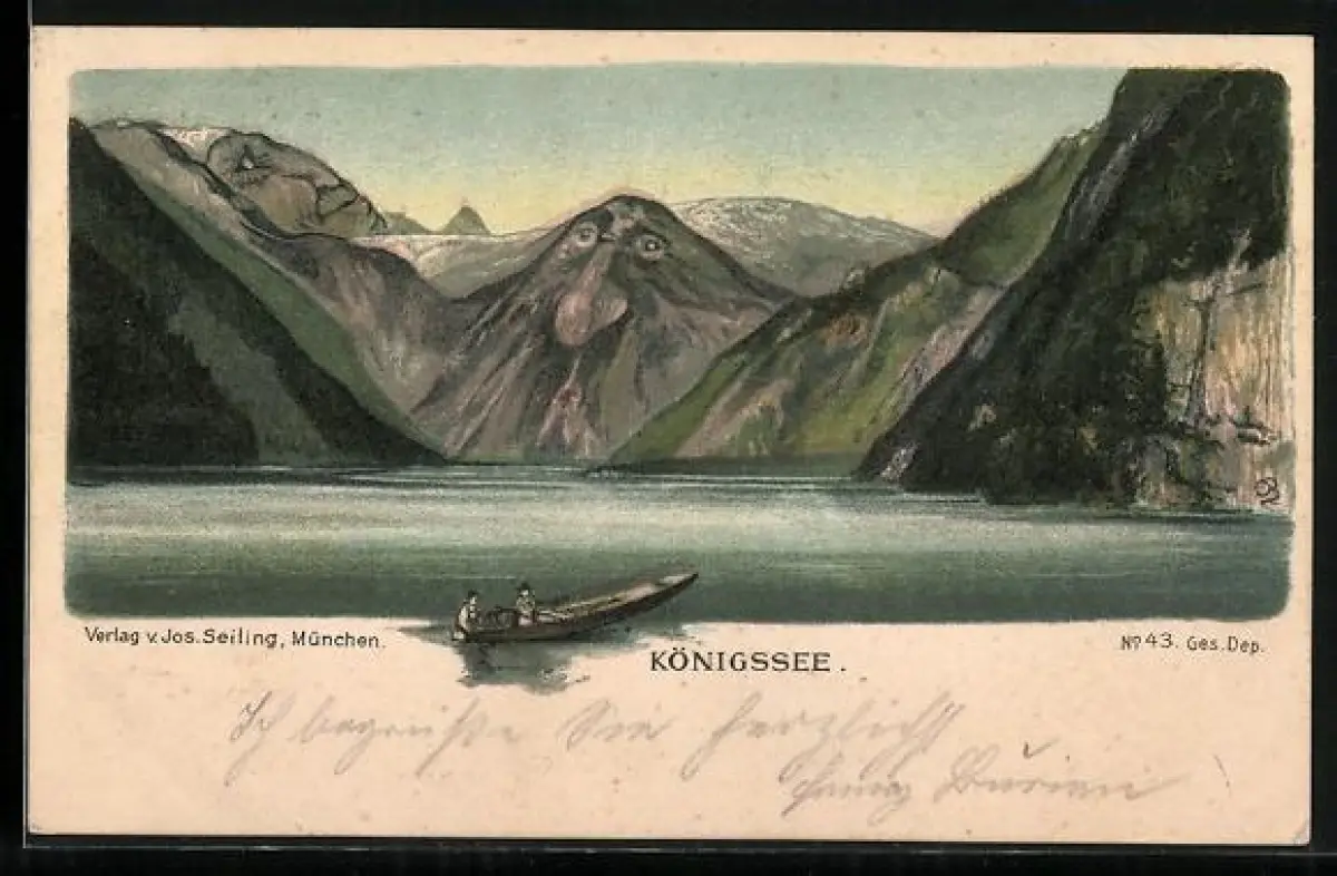 Lithographie Seiling Nr. 43, Königssee, Berg mit Gesicht / Berggesicht, Berggesichter