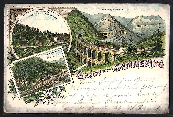 Lithographie Semmering, Stephanie-Hotel, Sonnwendstein mit Friedrich Schüler-Alpenhaus, Viadukt Kalte Rinne