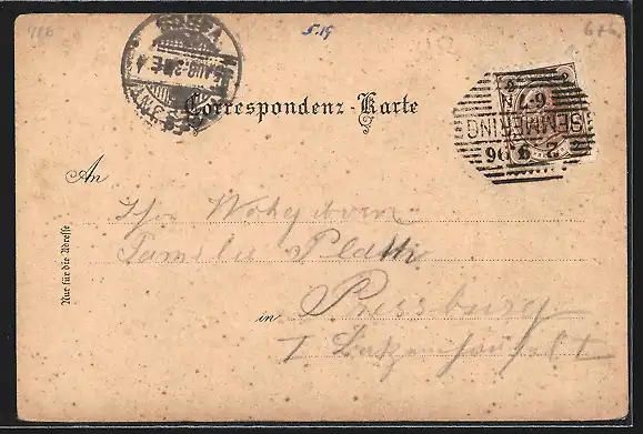 Personenbezogene Daten auf der Rückseite der Karte wurden durch blauen Textmarker unkenntlich gemacht. Die blauen Stellen sind auf die Vorderseite durchgeweicht und wirken sich negativ auf das Postkartenfoto aus