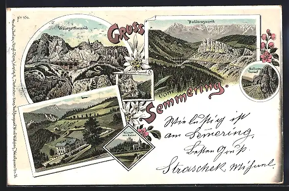 Lithographie Semmering, Weinzettlwand, Weinzettl-Tunnel, Klamm mit Ruine