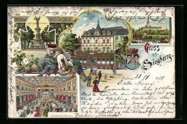 Lithographie Siegburg, Hotel Siegburger Hof mit grosssem Saal, Abtei, Kriegerdenkmal