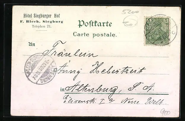 Personenbezogene Daten auf der Rückseite der Karte wurden durch blauen Textmarker unkenntlich gemacht. Die blauen Stellen sind auf die Vorderseite durchgeweicht und wirken sich negativ auf das Postkartenfoto aus