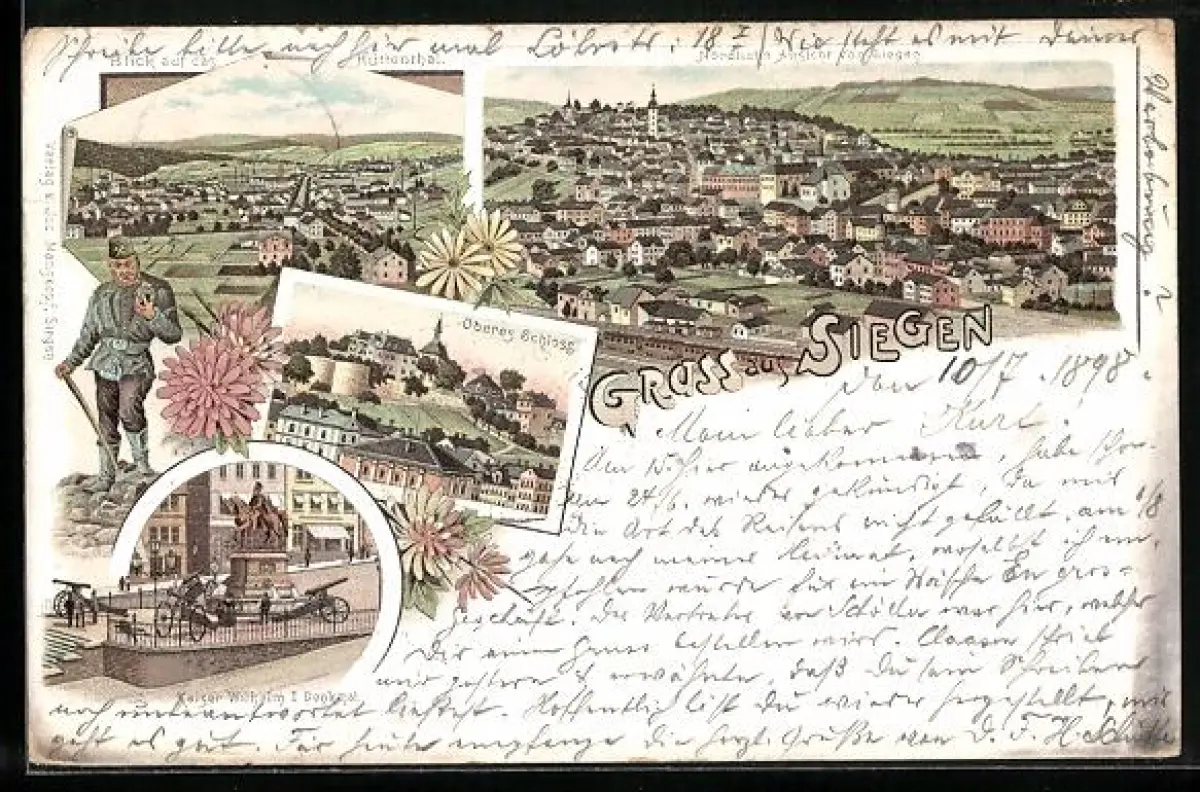 Lithographie Siegen, Bergmann, Hüttenthal, Oberers Schloss, Kaiser Wilhelm I.-Denkmal
