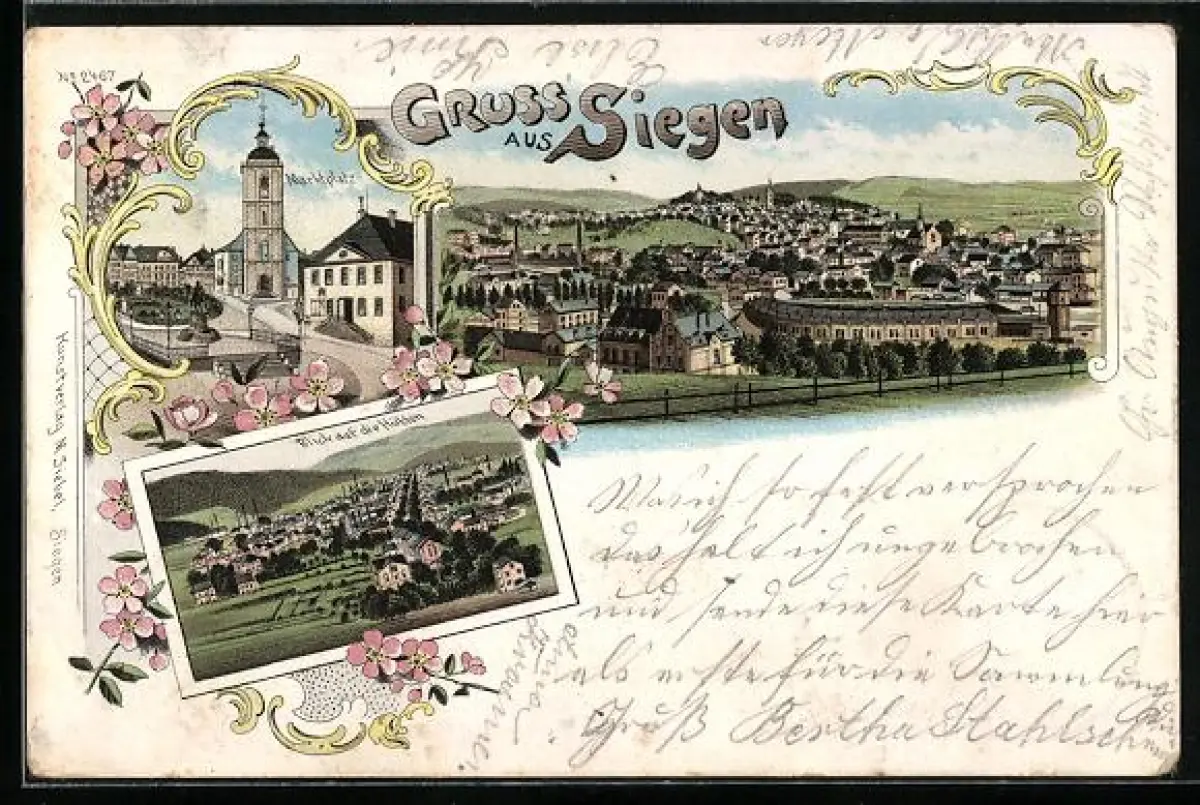 Lithographie Siegen, Marktplatz, Blick auf die Hütte, Gesamtansicht