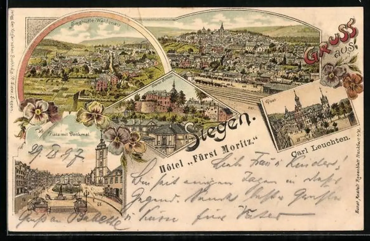 Lithographie Siegen, Totalansicht, Platz mit Denkmal, Bahnhof