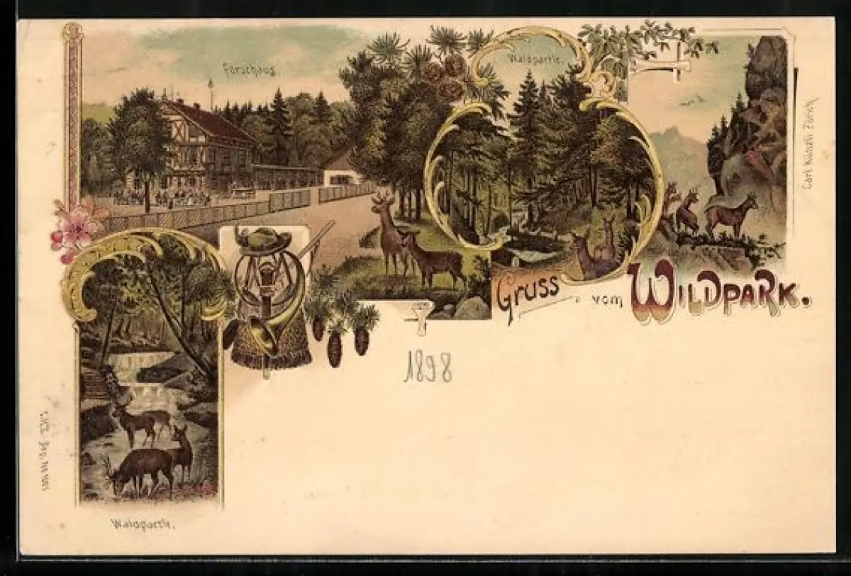 Lithographie Sihlwald, Forsthaus, Waldpartie, Rotwild