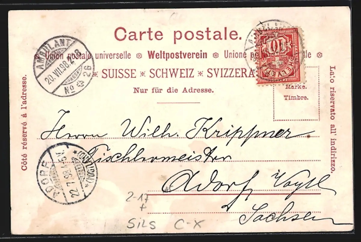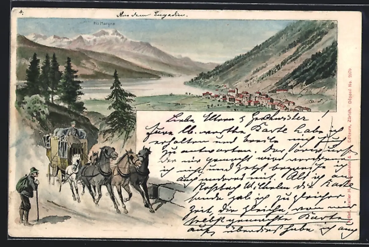 Lithographie Sils, Teilansicht mit Postkutsche, Im Hintergrund Piz Margna