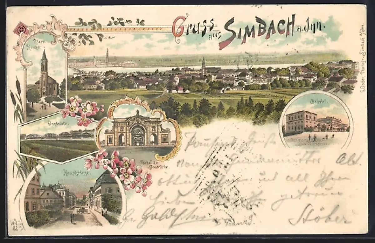Lithographie Simbach a. Inn, Totalansicht aus der Vogelschau, Pfarrkirche, Hauptstrasse, Bahnhof