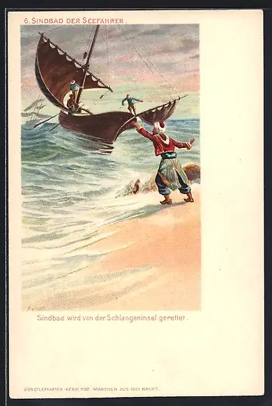 Lithographie Sindbad der Seefahrer, Sindbad wird v. d. Schlangeninsel gerettet, Märchen
