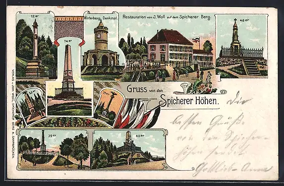 Lithographie Spicherer Höhen, Kriegerdenkmäler d. 40er, 39er u. 48er, Gasthaus von J. Woll a. d. Spicherer Berg