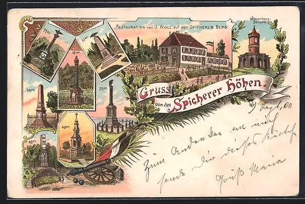 Lithographie Spicherer Höhen, Restauration von J. Woll, Winterberg-Denkmal, verschiedene Kriegsdenkmäler