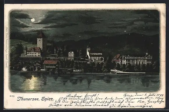 Lithographie Spiez / Thunersee, Teilansicht bei Vollmond