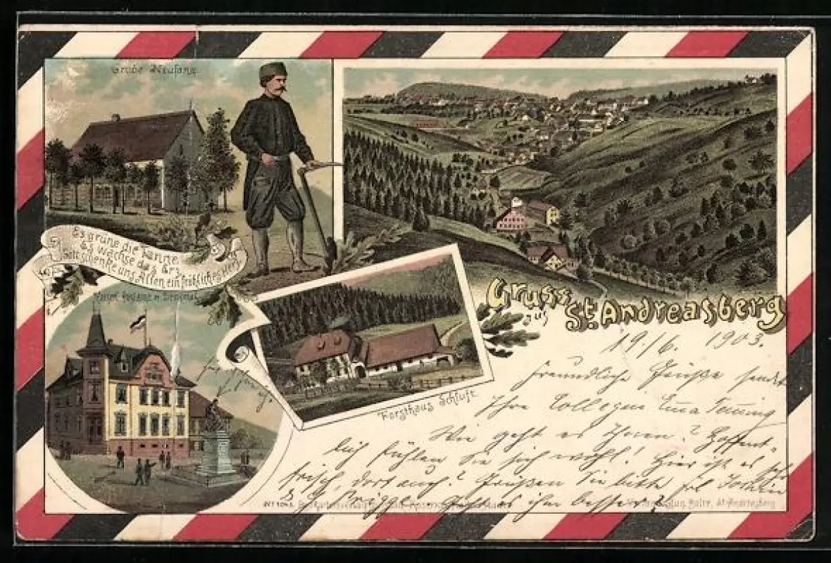 Lithographie St. Andreasberg, Grube Neufang, Forsthaus Schluft, Kaiserliches Postamt mit Denkmal, Grubenarbeiter