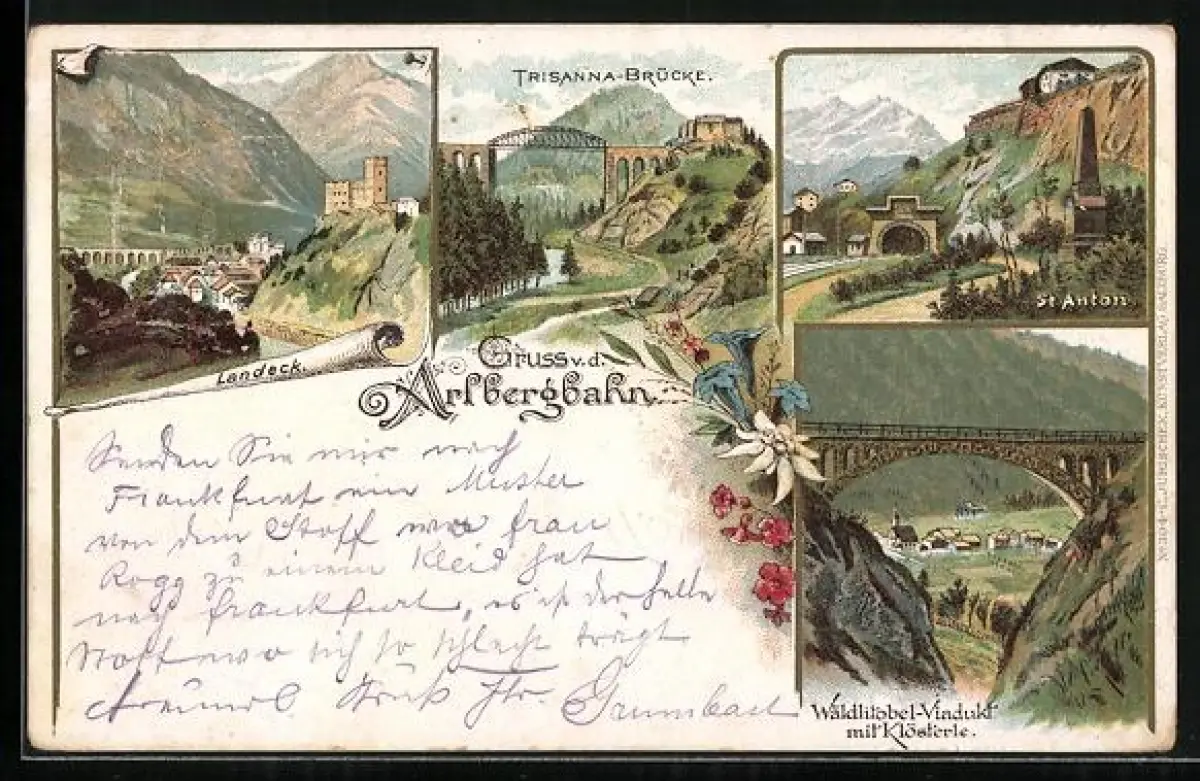 Lithographie St. Anton, Wäldlitobel-Viadukt mit Klösterle, Trisanna-Brücke, Landeck