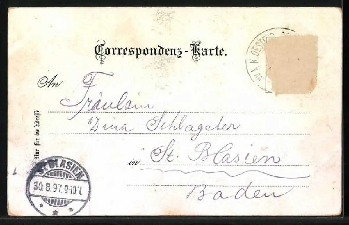 gelaufen 1897, Briefmarke entfernt, rückseitig Oberflächenschaden, guter Zustand