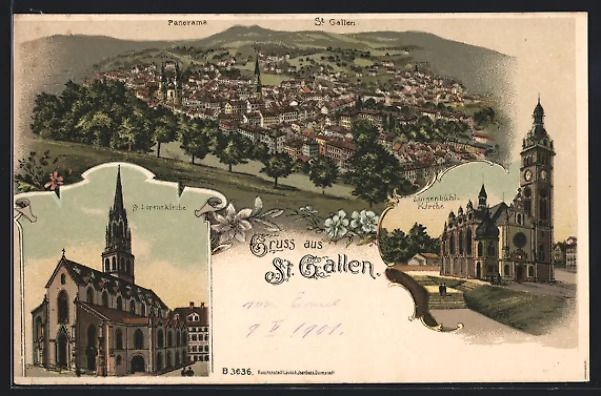 Lithographie St. Gallen, Lingenbühl-Kirche, St. Lorenzkirche, Totalansicht aus der Vogelschau