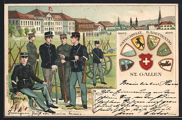 Lithographie St. Gallen, Ostschweiz. Kadettentag Sept. 1899, Soldaten in Uniform