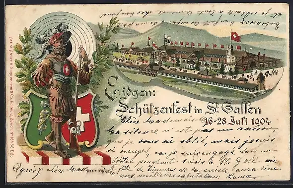 Lithographie St. Gallen, Schützenfest 1904, Schweizer in Tracht und mit Gewehr
