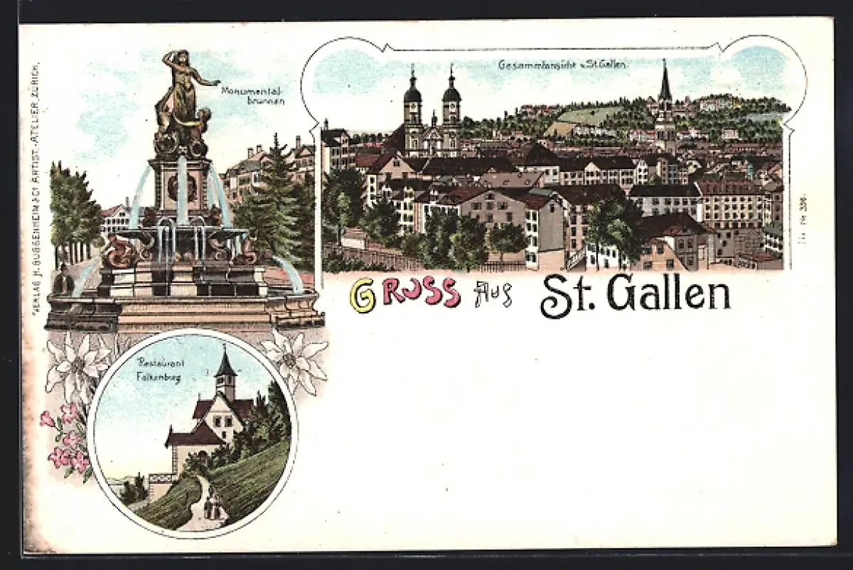 Lithographie St. Gallen, Totalansicht, Monumentalbrunnen, Restaurant Falkenberg