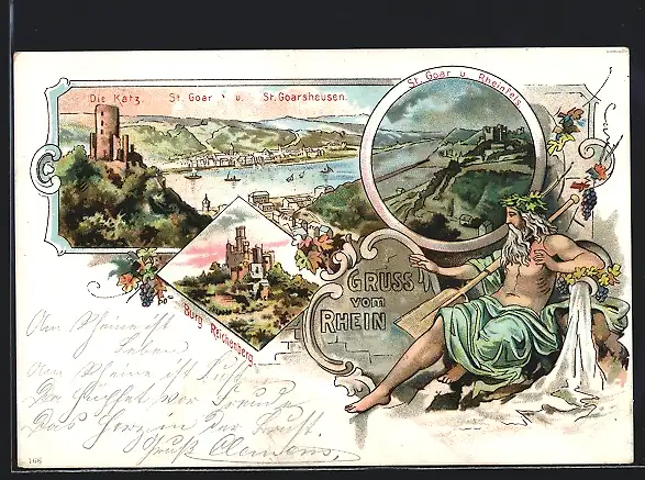Lithographie St. Goar, Die Katz, Teilausschnitte St. Goar, Rheinfels und St. Goarshausen