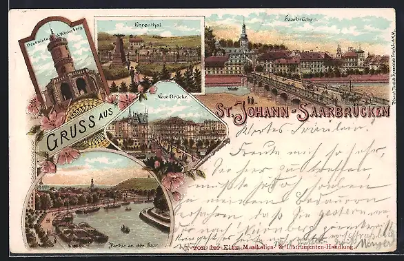 Lithographie St. Johann-Saarbrücken, Ortsansicht, Neue Brücke, Denkmal auf dem Winterberg