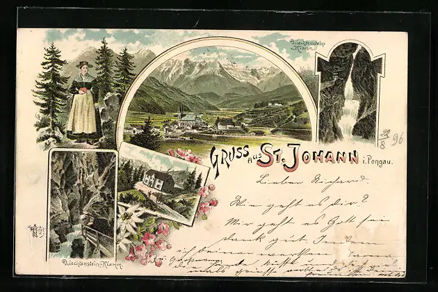 Lithographie St. Johann i. Pongau, Gasthaus, Liechtenstein-Klamm, Ortsansicht
