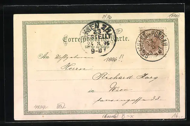 Personenbezogene Daten auf der Rückseite der Karte wurden durch blauen Textmarker unkenntlich gemacht. Die blauen Stellen sind auf die Vorderseite durchgeweicht und wirken sich negativ auf das Postkartenfoto aus