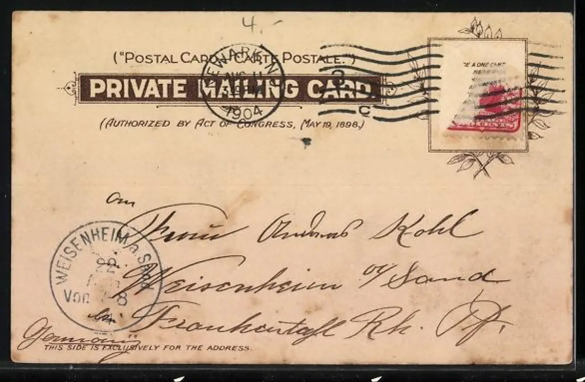 gelaufen 1904, Briefmarke entfernt, rückseitig Oberflächenschaden, guter Zustand