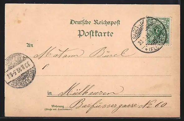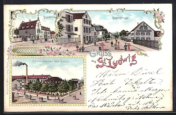 Lithographie St. Ludwig, Postgebäude, Baslerstrasse, Seidenbandfabriken Gebr. Sarasin