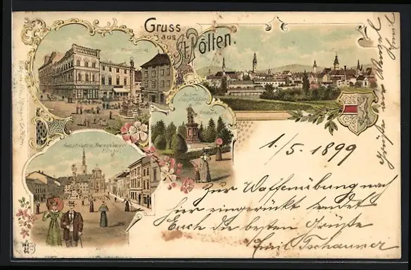 Lithographie St. Pölten, Hauptplatz mit Franziskaner-Kirche, Herrenplatz, Kaiser Joseph-Statue im Stadtpark