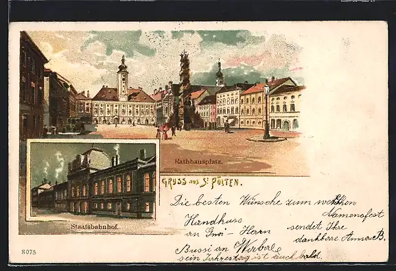 Lithographie St. Pölten, Rathhausplatz und Staatsbahnhof